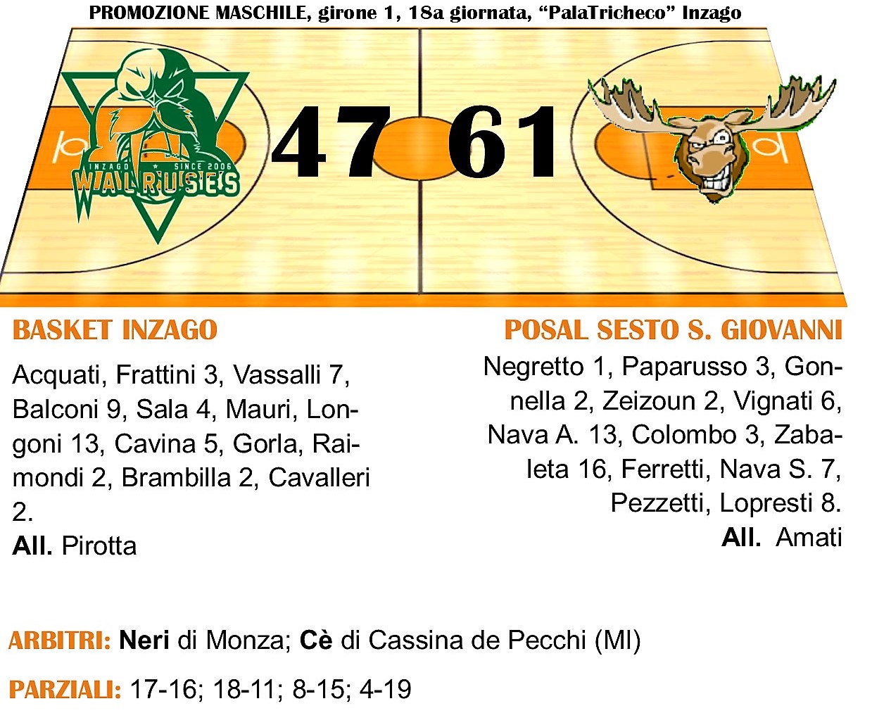Posal, rimonta di classe. Nella diciottesima giornata del campionato di Promozione, la formazione di coach Amati è riuscita a imporsi per 47-61 dopo una lunga rincorsa. Il Basket Inzago, a lungo padrone del campo nel corso del primo periodo, è stato costretto a raccogliere la  terza sconfitta consecutiva.