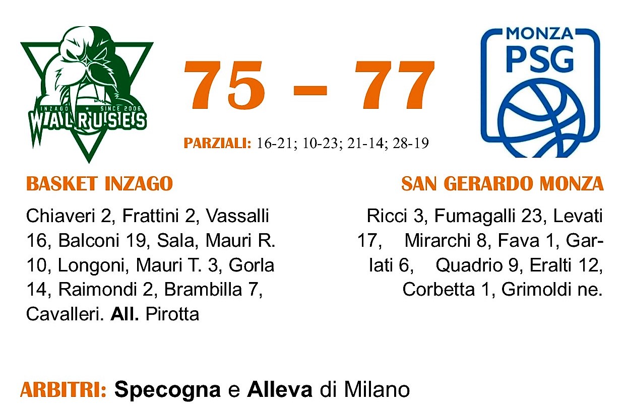 San Gerardo strappa i due punti con tenacia. A Inzago non basta l’orgoglio. Grazie alla vittoria in volata per 75-77, la formazione monzese è riuscita a staccarsi dall’ultima posizione, salendo in tredicesima a quota 6 in attesa della sfida della Virtus Meda domenica 2 febbraio. Inzago, rientrata in partita troppo tardi, è rimasta ferma a quota 14 nel limbo tra playoff e playout.
