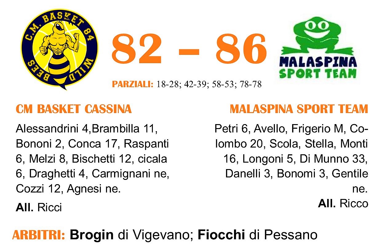 Cassina si è tenuta in vantaggio anche nella ripresa, toccando anche il + 8 al 25 (52-44), mancando però più volte la fuga definitiva. Malaspina ha fatto leva sull’esperienza in area di Colombo, e grazie ai punti del suo pivot è rimasta in scia chiudendo sul- 5 (58-53) all’ultima sirena. L’ultimo quarto regolare è stato un elastico. Malaspina è arrivata fino a – 2 al 33°(64-62), ma è stata prontamente riallontanata fino al 76-69 a degli ultimi 90 secondi. Diverse palle perse e scelte di tiro affrettate hanno impedito a Cassina di gestire gli ultimi possessi con efficiacia e Malaspina ne ha subito approfittato, con Di Munno che dall’arco ha trovato la tripla del pareggio all’ultimo possesso.