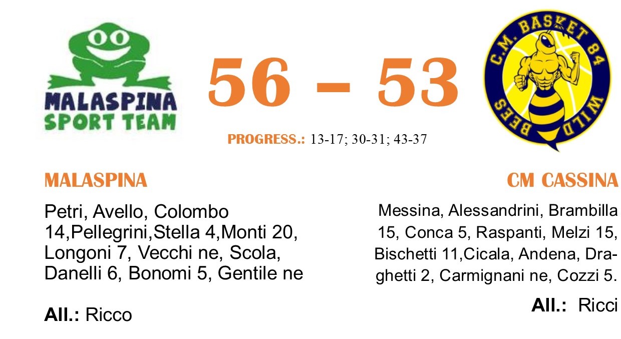 Il punto di vantaggio con cui il CM chiude la prima frazione è stato difeso e incrementato nei primi minuti, ma con tre triple consecutive Malaspina ha ribaltato la partita (39-35 al 26’). Il CM ha perso lucidità, consentendo a Malaspina di colpire più volte in contropiede. Le Frogs hanno spinto sull’acceleratore dino al 43-37 con cui si è chiusa la terza frazione. Brambilla ha tenuto a contatto il CM nel momento di massima difficolta, quando Malaspina ha allungato nei primi minuti fino al 54-46 del 35’. La partita è sembrata indirizzata verso la sponda dei verdi di casa, ma è stato ancora Brambilla, a suon di triple, a ricucire il divario e a portare ad un minuto dal termine un solo punto di scarto tra le squadre. Cassina non ha centrato l’occasione del sorpasso a 40 secondi dalla fine e il conseguente tentativo di fallo sistemico ha premiato la freddezza di Monti. Prossimi impegni: Malaspina affronterà Carate in trasferta domenica, mentre per il CM è in arrivo un altro grande classico contro il Basket Melzo, venerdì.