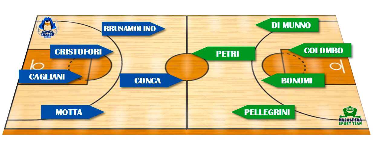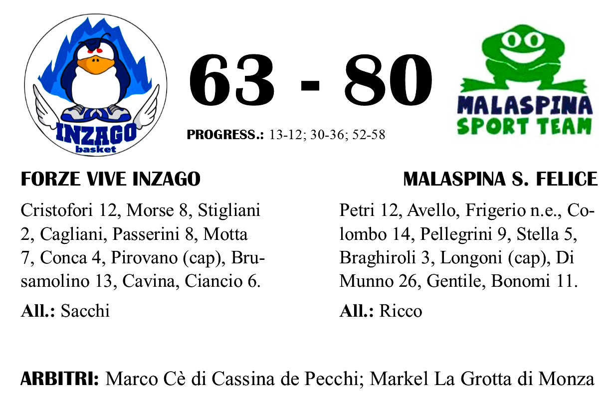 All’alba della sfida, la maggior grinta dentro l’area dei Pinguini di Colombo, Bonomi e Di Munno ha portato Malaspina in leggero vantaggio dopo i primi giri di cronometro. Inzago ha pagato gli errori al tiro dalla lunga distanza, ma nei possessi finali è riuscita a ribaltare il parziale con il canestro di Cristofori, dopo qualche palla persa di troppo di Malaspina in costruzione. Inzago ha subito allungato in avvio di secondo quarto, volando a +5 con Conca e Passerini, ma poi, così come gli errori di Malaspina in gestione avevano permesso il rientro inzaghese, altrettanti possessi mal amministrati hanno permesso alle Frogs di rientrare subito in partita con Petri e di sorpassare con Pellegrini, Di Munno e di nuovo Petri, freddo sia ai liberi che dalla media, che ha portato Malaspina sul +6 dell’intervallo (30-36 al 20’).