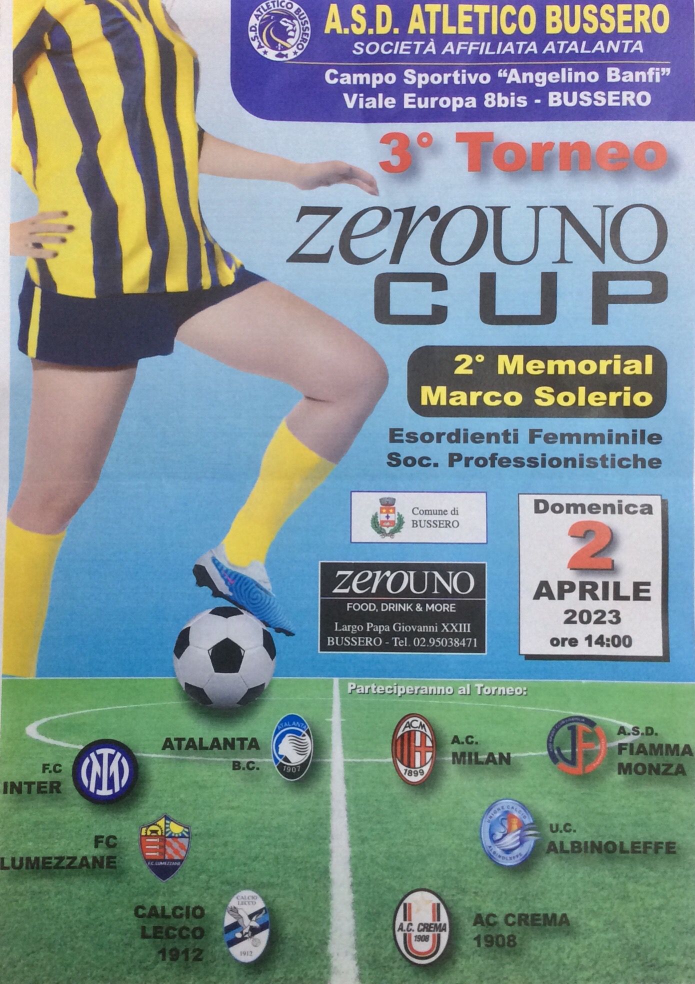 Torna, domenica 2 aprile 2023, presso il campo sportivo Angelino Banfi di viale Europa 8 bis, la Zerouno Cup – 2° Memorial Marco Solerio, torneo di calcio femminile giunto alla terza edizione, riservato a squadre professionistiche, organizzato dal dirigente/segnalatore AC Monza Claudio Marchesi per conto dell’Atletico Bussero.