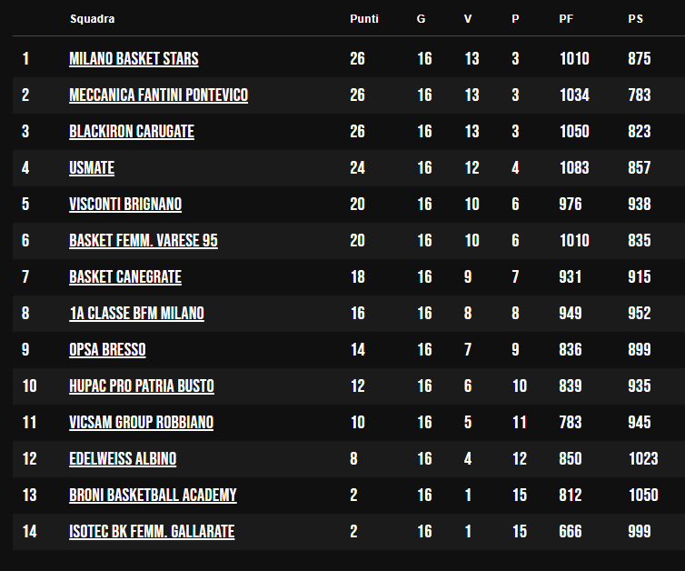 Ma la Blackiron di questo periodo non vuole fare prigionieri: l’intensità difensiva aumenta ancora e lo stesso vale per la qualità offensiva; Canegrate nel terzo periodo è costretta a soli 9 punti segnati mentre dall’altra parte del campo Usuelli, dopo aver passato il primo tempo a segnare traccianti per le compagne, si mette in proprio con un paio di canestri dei suoi, Bremaud pende le misure dalla distanza e una Chiara Poma sempre più inserita nei meccanismi di Stibiel chiudono il parziale alla terza sirena, 22-9 che in pratica sancisce la fine delle ostilità. Nel quarto periodo c’è spazio anche per le giovani e per il primo canestro in serie B di Rogata: 77-47 il finale che, in coincidenza della sconfitta casalinga della Milano Basket Stars nel derby contro la BFM, vale il primo posto in classifica in compagnia delle milanesi appunto e di Pontevico.