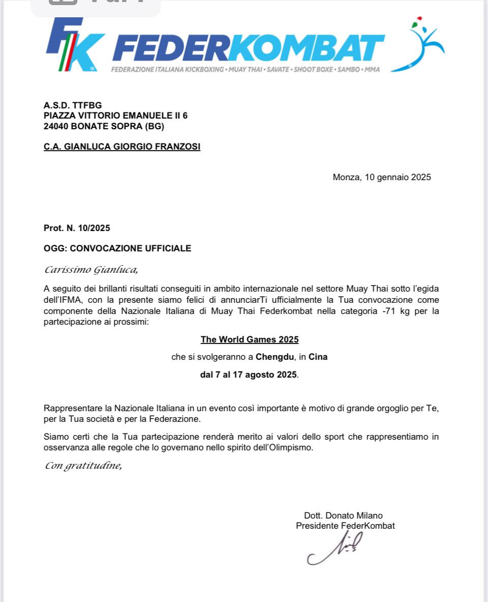 Gianluca Giorgio Franzosi è il nostro unico rappresentante ai World Games 2025 a Chengdu! Dopo un’accurata selezione, l’Ifma ha scelto il campione della Top Team Fight Bergamo per difendere i colori della nostra nazione nella categoria -71kg.