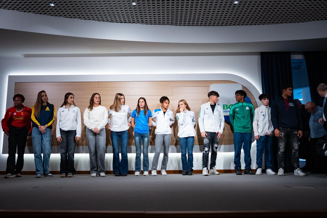 Con la verve di Germano Lanzoni si sono svolte, nella seconda parte dell’evento, le premiazioni finali del Progetto Talento 2025, operazione che ha raggiunto un nuovo record di giovani atleti supportati, ben 83, sostenuti con borse di studio di diverso valore economico (suddivise in fasce Oro, Argento e Bronzo). Tra i ragazzi premiati all’Auditorium BCC Milano anche volti già arrivati a risultati di livello internazionale in ambito giovanile: su tutti spiccano i nomi di Kelly Ann Doualla Edimo (Pro Patria Milano Atletica), primatista europea Under 18 dei 100m, campionessa europea Under 20 di 100m e 4×100 e oro nei 100m e nella staffetta 100+200+300+40 nel Festival Olimpico della Gioventù Europea Under 18, e Francesco Crotti (Pro Patria Milano Atletica), oro europeo Under 20 del salto triplo; applauditi anche Andrea Bernardi (Atletica Riccardi Milano 1946), azzurro della 4×100 agli ultimi Mondiali Assoluti a Tokyo, e del terzetto Alice Caglio (Vis Nova Giussano), Giulia Macchi (Bracco Atletica), Francesca Meletto (Atletica Brescia 1950), bronzo con l’Italia (in un quartetto per tre quarti lombardo) sempre agli Europei Under 20. Tra loro anche storie importanti di resilienza come quelle di un’emozionata Francesca Mentasti (Pro Sesto Atletica Cernusco) e Riccardo Ambrosio (Varese Atletica), entrambi approdati all’azzurro in estate (rispettivamente agli Europei Under 23 e agli Europei Under 20) nonostante problematiche fisiche di difficile lettura e risoluzione. Qui è disponibile l’elenco completo di tutte le borse di studio.