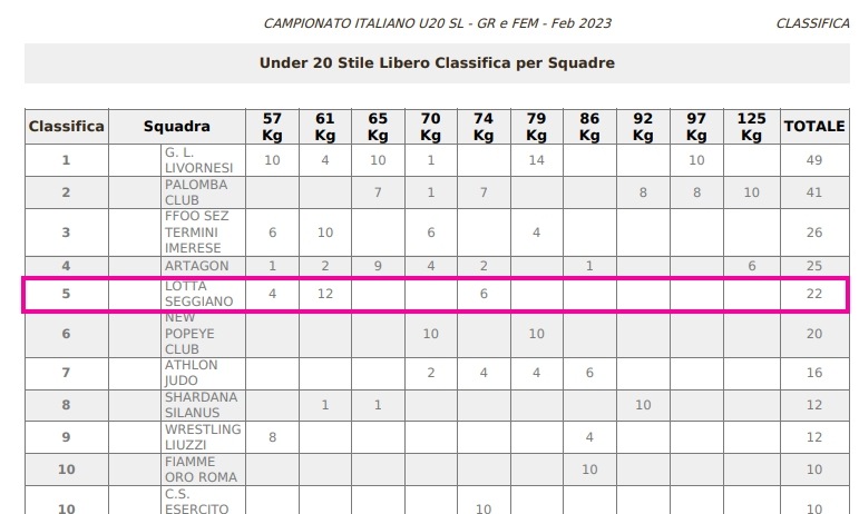 Nella classifica nazionale a squadre su 40 società sportive in gara il Lotta Club Seggiano ha conquistato un prestigioso quinto posto.