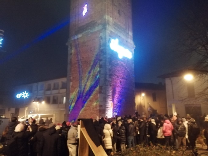 Si sono così illuminati l’arco e l’albero di Natale allestiti in questi giorni e, successivamente, anche la Torre Civica di fianco al municipio su cui sono state proiettate immagini natalizie.