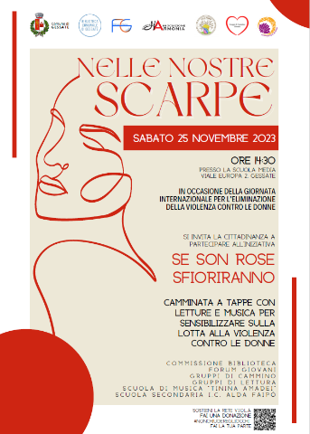 “Nelle nostre scarpe”: Una camminata che a partire dall’Amministrazione Comunale e dalla Commissione Biblioteca coinvolge diversi attori della nostra comunità in occasione della “Giornata Internazionale per l’Eliminazione della Violenza Contro le Donne”.