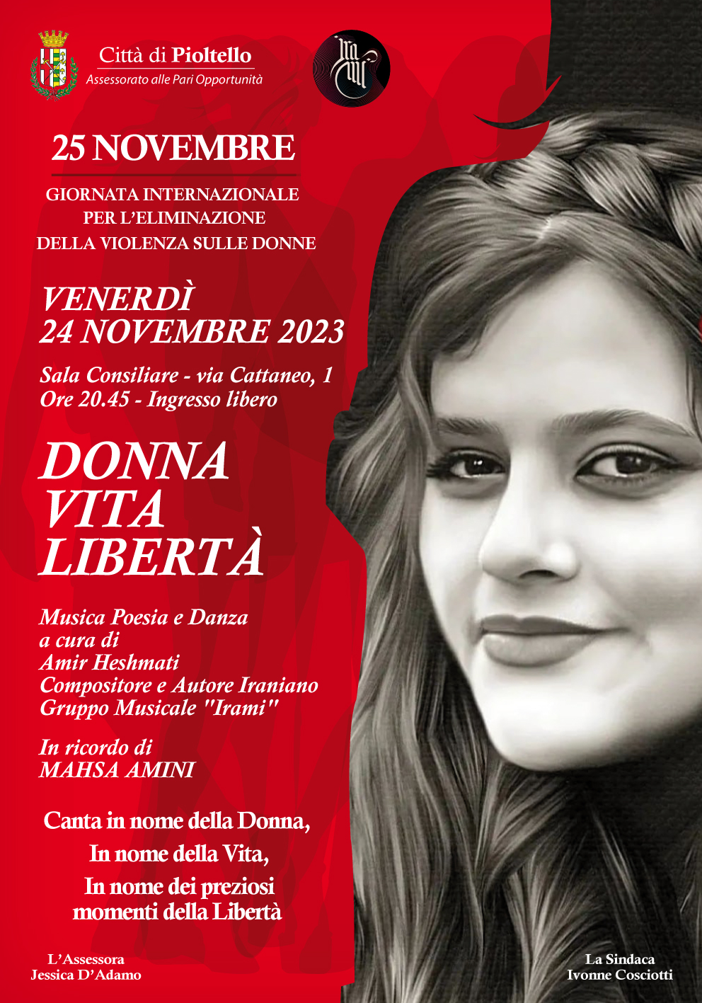 In occasione della Giornata internazionale contro la violenza sulle donne, venerdì alle 20.45 in sala consiliare di via Cattaneo 1 un concerto evento a cura di Amir Heshmati, compositore e autore Iraniano con il Gruppo Irami. Le sue composizioni sono ispirate e dedicate alle donne che coraggiosamente combattono contro un regime che si rende responsabile di violenze quotidiane nei loro confronti. Un evento in ricordo di Jina Mahsa Amini.