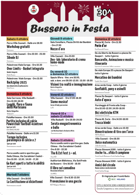 Lo sport per tutti e di tutti. Si apre così la trentesima edizione di “Bussero in festa”, la tradizionale manifestazione che animerà il paese a partire da sabato 4 ottobre 2025 sino alla prossima domenica, 12 ottobre 2025.