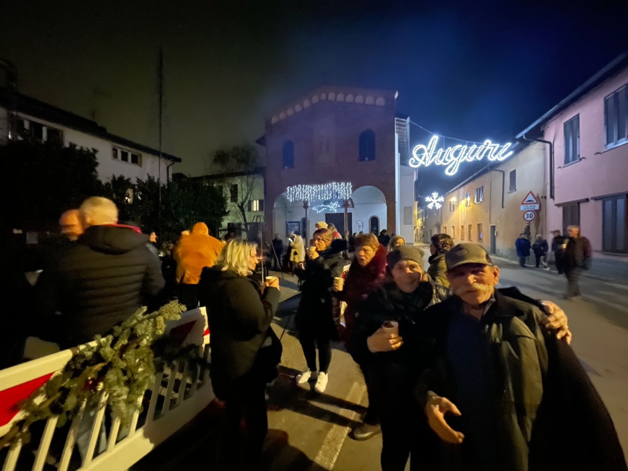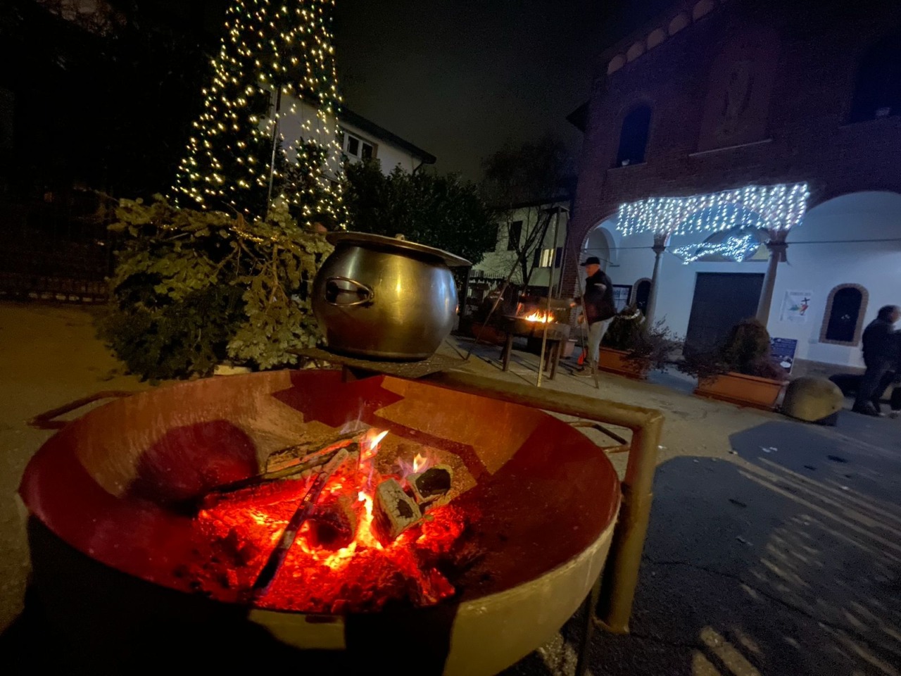 Ieri sera, sabato 20 dicembre 2025, lo spazio quotidiano davanti alla Chiesa dei Santi Eusebio e Maccabei, cuore storico della comunità, si è trasformato in un salotto a cielo aperto, riscaldato dalle luci dell’albero, dal crepitio dei bracieri e dalle voci delle persone.