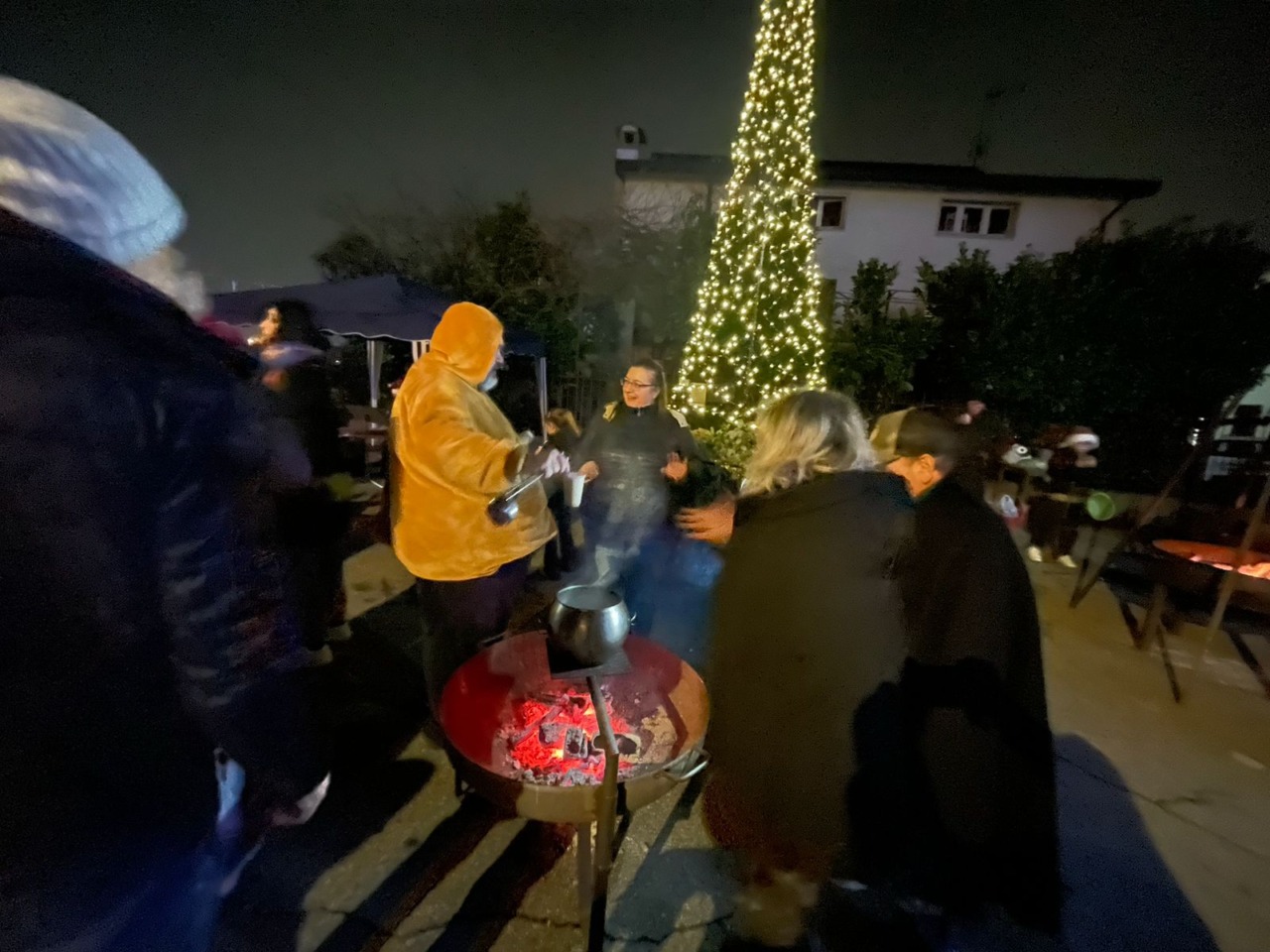 Sotto il grande albero illuminato, che ha fatto da sentinella nella notte umida della campagna, si sono ritrovate famiglie, anziani e gruppi di amici. Il ritmo è stato quello lento della conversazione, del fermarsi senza fretta per scambiarsi gli auguri e riconoscersi. L’atmosfera è stata animata dal profumo delle castagne arrostite sotto le padelle, dal fumo del vin brulé e dalla cioccolata calda passata di mano in mano, mentre il panettone veniva condiviso in gesti familiari. A fare da colonna sonora, i canti natalizi e la fisarmonica di Italo hanno accompagnato risate e racconti.