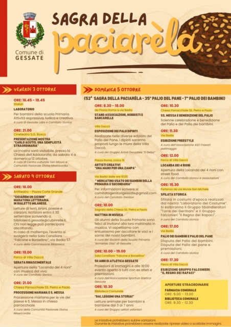 E’ stato pubblicato il programma della Sagra della Paciàrèla, tradizionale appuntamento dell’autunno a Gessate dedicato alla prelibata torta di pane e latte tipica della Pianura Padana. L’evento, che si terrà dal 3 al 5 ottobre, promette come sempre di animare il paese con una serie di appuntamenti per tutte le età, tra cultura, musica, cibo e divertimento.