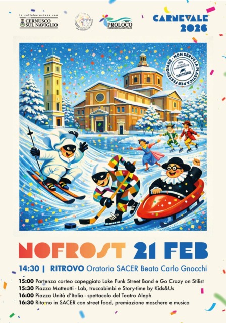 C’è aria di festa e di sport a Cernusco sul Naviglio. Sabato 21 febbraio il Carnevale cittadino indosserà i colori dei cinque cerchi: “Nofrost” è il nome della manifestazione che quest’anno si ispira alle Olimpiadi invernali di Milano Cortina, unendo l’allegria delle maschere alla magia dei paesaggi innevati e delle discipline olimpiche.