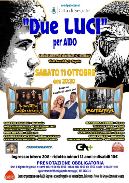 “Due Luci per AIDO” è l’evento che andrà in scena sabato 11 ottobre alle 20.30 a Cascina Commenda, in via Amendola 3. Un concerto tributo ai grandi Lucio Battisti e Lucio Dalla con le band “Il nostro canto libero” e “Futura”. A presentare l’evento Katia Fiorelli e Flavio Zinni.